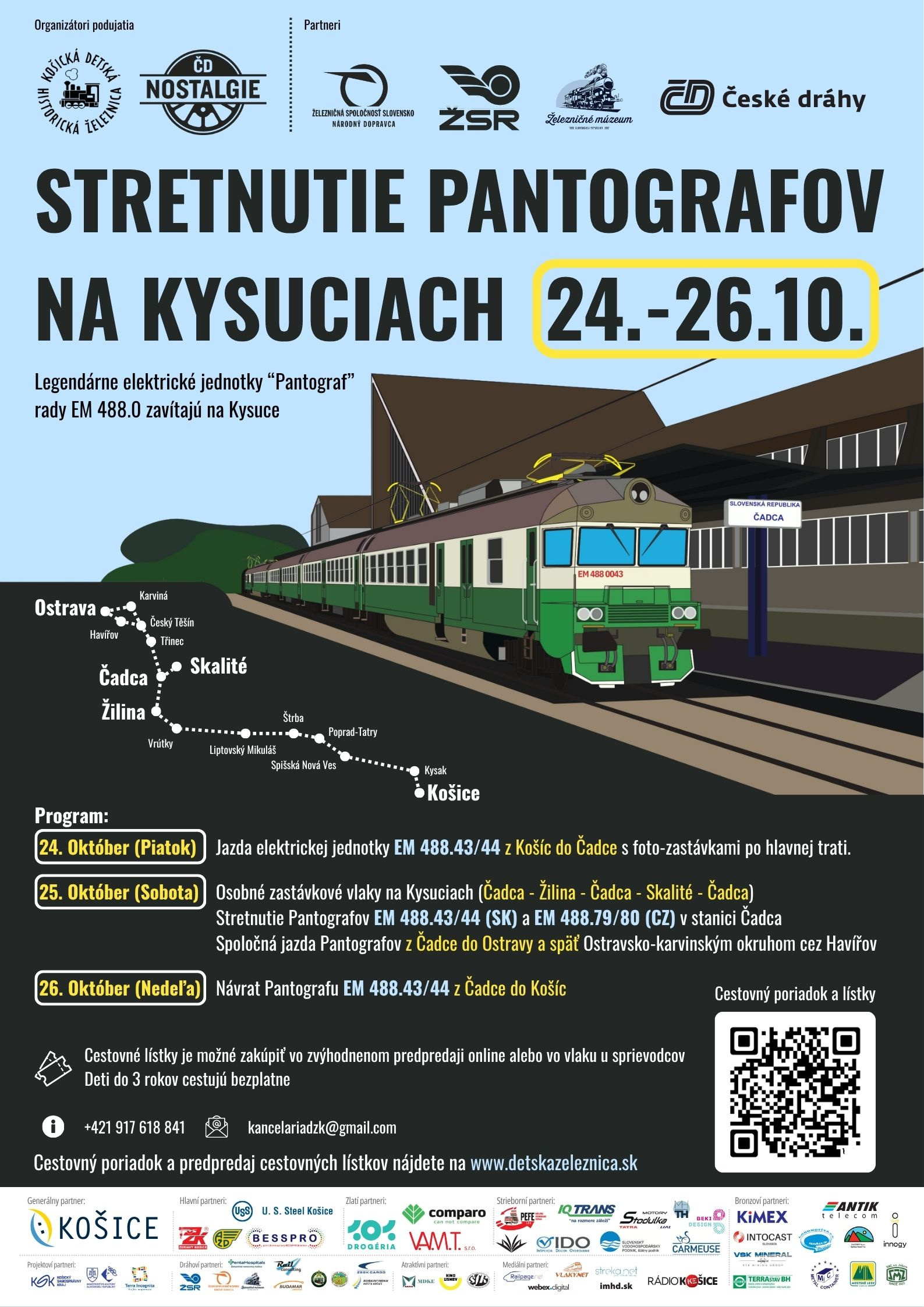 Pantografy rady 460 (pôvodným označením EM 488.0) sa po rokoch opäť vracajú na Kysuce!Detská železnica Košice v spolupráci s ČD Nostalgie a s podporou partnerov z radov železničných dopravcov a nadšencov historických vozidiel pripravila pre všetkých fanúšikov železníc a technických zaujímavostí mimoriadne jazdy historických elektrických jednotiek, ktoré koncom 90-tych rokoch istú chvíľu neodmysliteľne patrili k regiónu Žiliny a Čadce. V sobotu 25.10. sa v stanici Čadca uskutoční aj jedinečné stretnutie posledného českého pantografu EM 488.79/80 s košickým EM 488.43/44. Po jazde do Skalitého a späť sa obe jednotky spoja do spoločného vlaku a vydajú na cestu Ostravsko-karvinským okruhom z Čadce do Ostravy odkiaľ sa košický pantograf vráti cez Havířov späť do Čadce. Cieľom podujatia je pripomenúť si éru prevádzky Pantografov v okolí Žiliny a Čadce pred blízkou transformáciou jednosmernej trakčnej napájacej sústavy na striedavú v stanici Žilina kedy už nebude možné takéto jazdy opakovať.